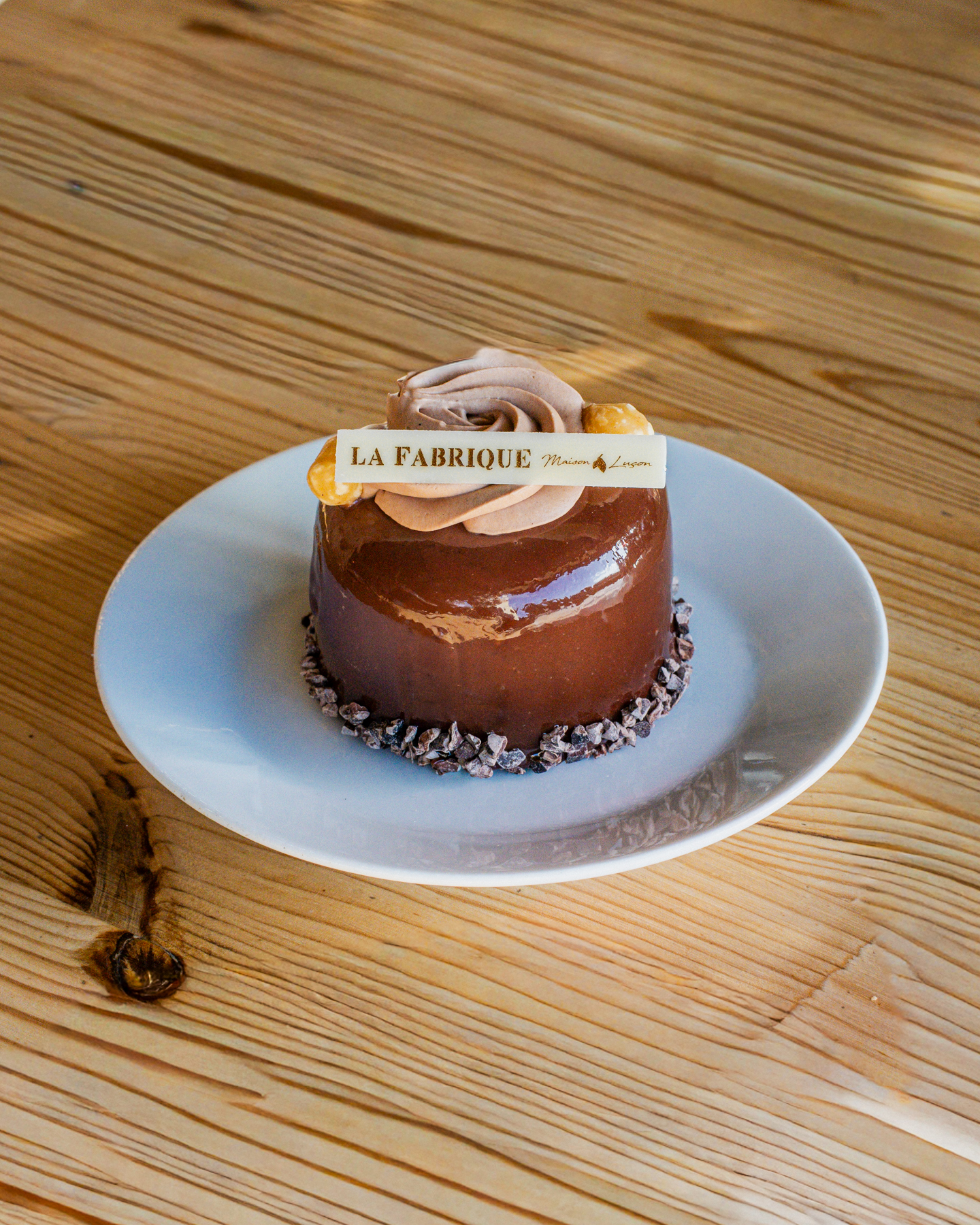 Mousse chocolat noir 67%, crémeux caramel au beurre salé, noisettes torréfiées, biscuit au chocolat sans farine .